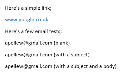 The final option, an email link with a subject AND a body, is a little more complicated. Word doesn't seem to offer a way of doing this through the "Email address" interface so you'll need to craft the link in direct HTML. The easiest way to do this is to use the same "Existing file or web page" we used to create the first link to Google;